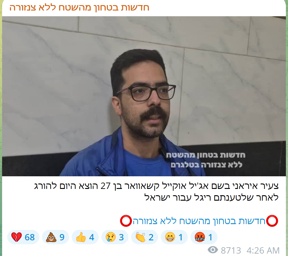 >>523962334Am Israel AckkkA young Iranian named Ajil Okail Kashavar, 27, was executed today after allegedly spying for Israel