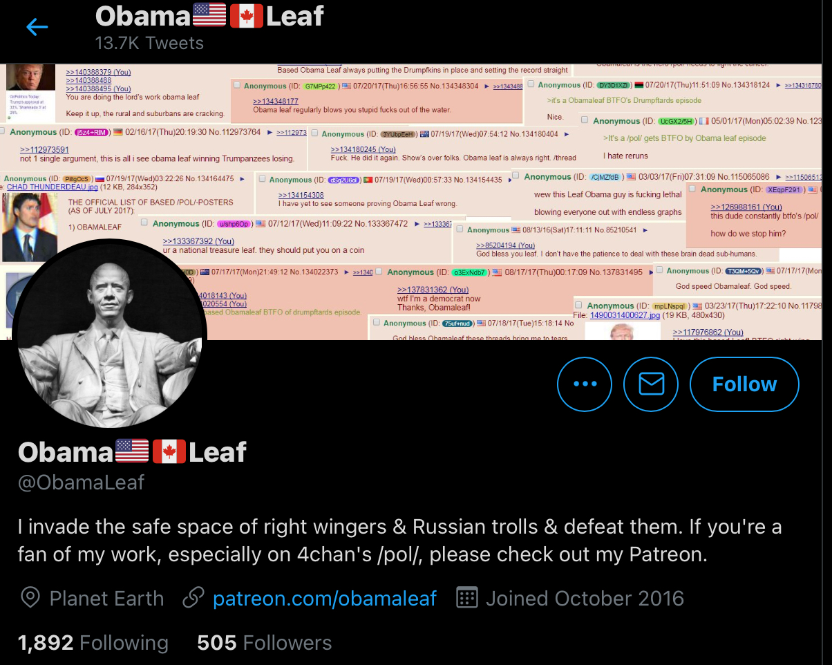 >>523977290Remember the lObama Leaf anon who used to spam CNN tier Obama worship, and retards would fall for that bait 300+ times per hour?