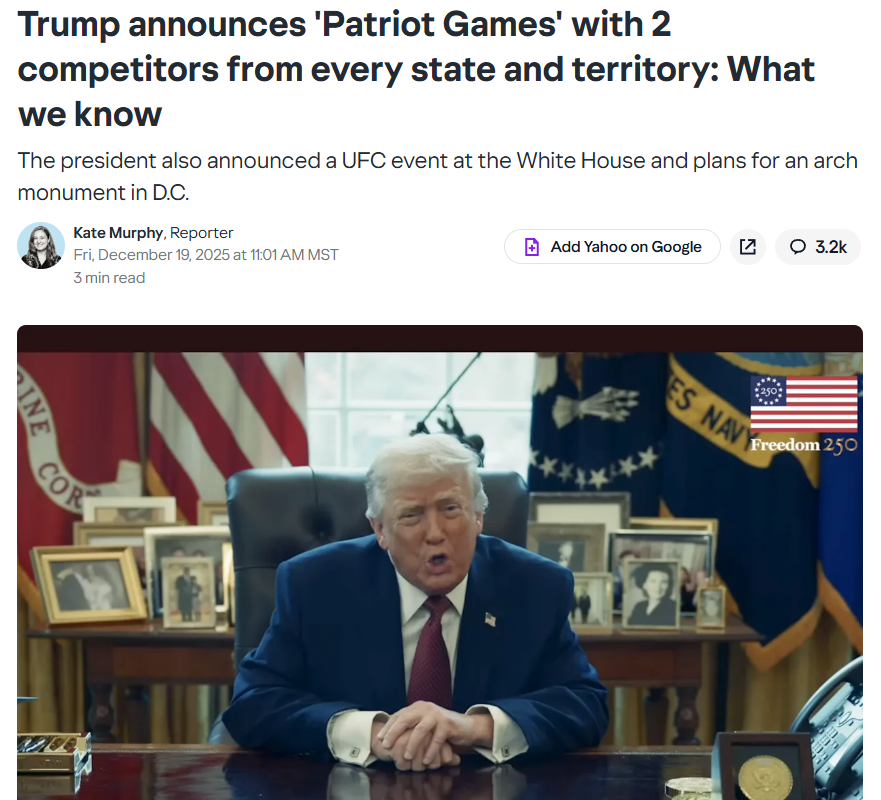 >“In the fall, we will host the first-ever Patriot Games, an unprecedented four-day athletic event featuring the greatest high school athletes — one young man and one young woman from each state and territory,” Trump said.>The president previously spoke about the competition in July, saying it would be televised and led by Health and Human Services Secretary Robert F. Kennedy Jr.https://www.yahoo.com/news/us/article/trump-announces-patriot-games-with-2-competitors-from-every-state-and-territory-what-we-know-180117132.html?fr=sycsrp_catchallMay the odds be ever in your favor...