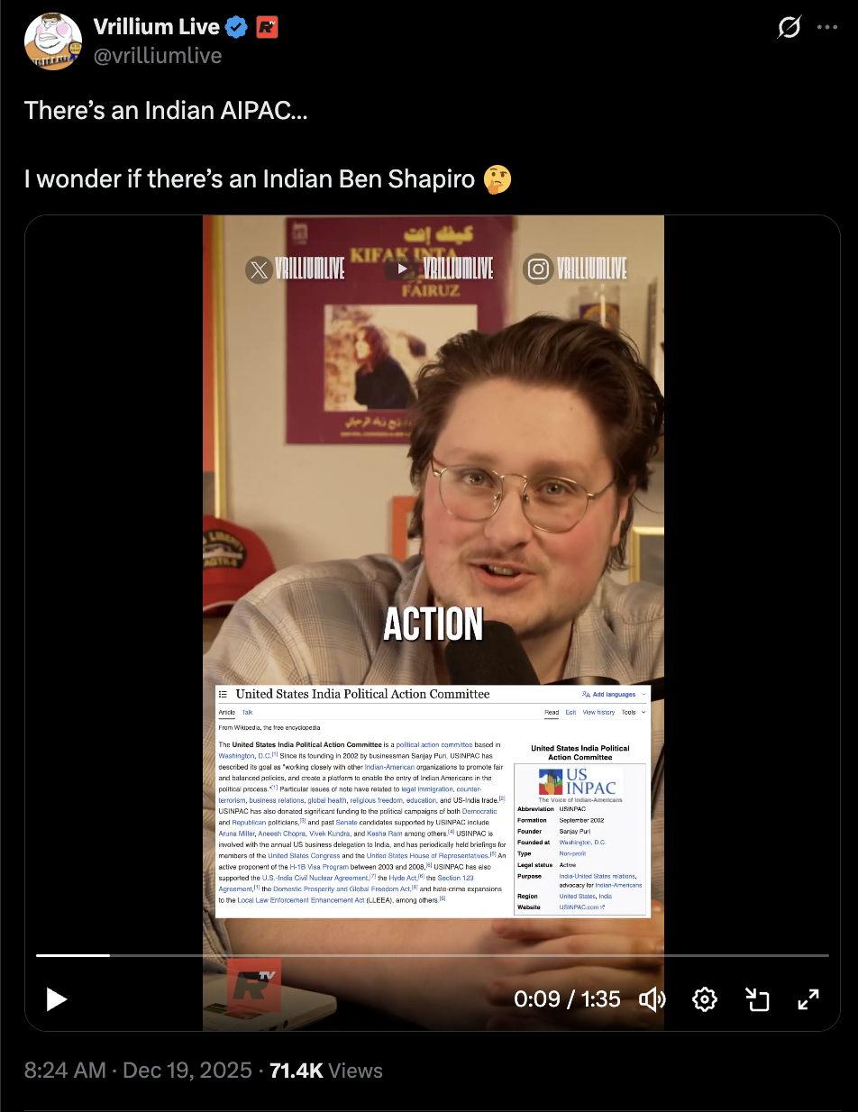 There's an indian AIPAC nowhttps://x.com/vrilliumlive/status/2002007093700931635
