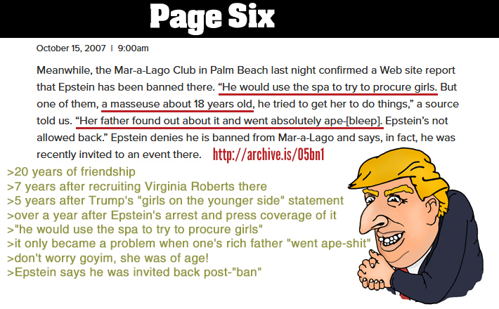 >>523986674Epstein was banned from Mar-a-Lago in 2007, over a year after his arrest.Despite their relationship being strained at the time, over the real estate dispute from 2004, Trump's Mar-a-Lago covered for him, and lied about the 15-year-old masseuse being of age.The Mar-a-Lago story only makes Trump look worse. Why was someone who'd just been arrested for crimes with underage girls allowed there? Why did it take a father "going ape-shit" and threatening to harm the Trump brand to get him banned, despite him having repeatedly "taken" Trump's underage employees?
