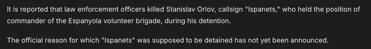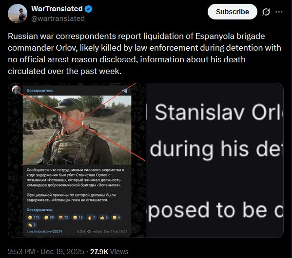 Russian war correspondents report liquidation of Espanyola brigade commander Orlov, likely killed by law enforcement during detention with no official arrest reason disclosed, information about his death circulated over the past week.https://x.com/wartranslated/status/2002029516873404805?s=20>yesterdaypic 1https://files.catbox.moe/nzgjie.jpgpic 2https://files.catbox.moe/bbz16y.png
