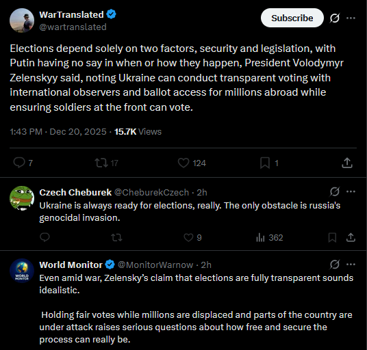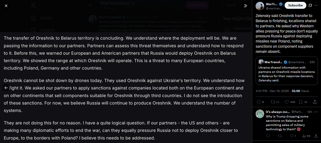 Zelensky said Oreshnik transfer to Belarus is finishing, locations shared to partners. He asked why Western allies pressing for peace don't equally pressure Russia against deploying missiles near Poland, noting sanctions on component suppliers remain absent.https://x.com/wartranslated/status/2002046556036595961?s=20>yesterdaypic 1https://files.catbox.moe/nvqvpv.jpegpic 2https://files.catbox.moe/och2sf.png