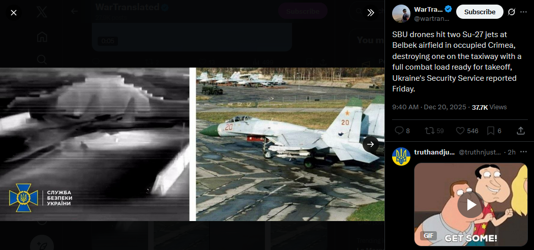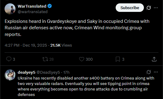 Explosions heard in Gvardeyskoye and Saky in occupied Crimea with Russian air defenses active now, Crimean Wind monitoring group reports.https://x.com/wartranslated/status/2002053105228316676?s=2022h