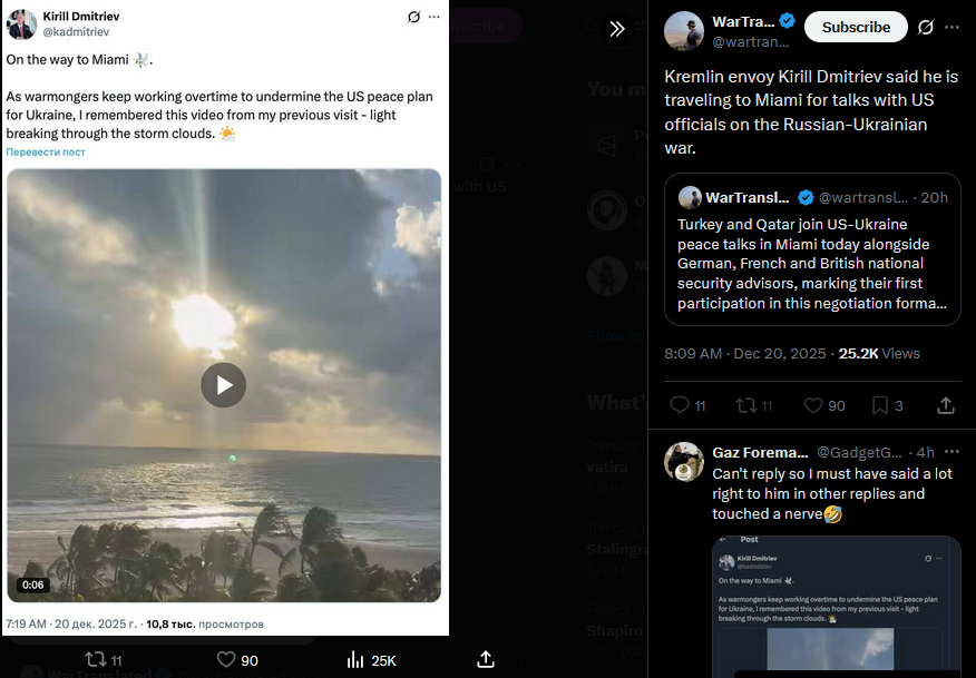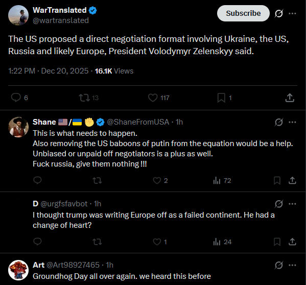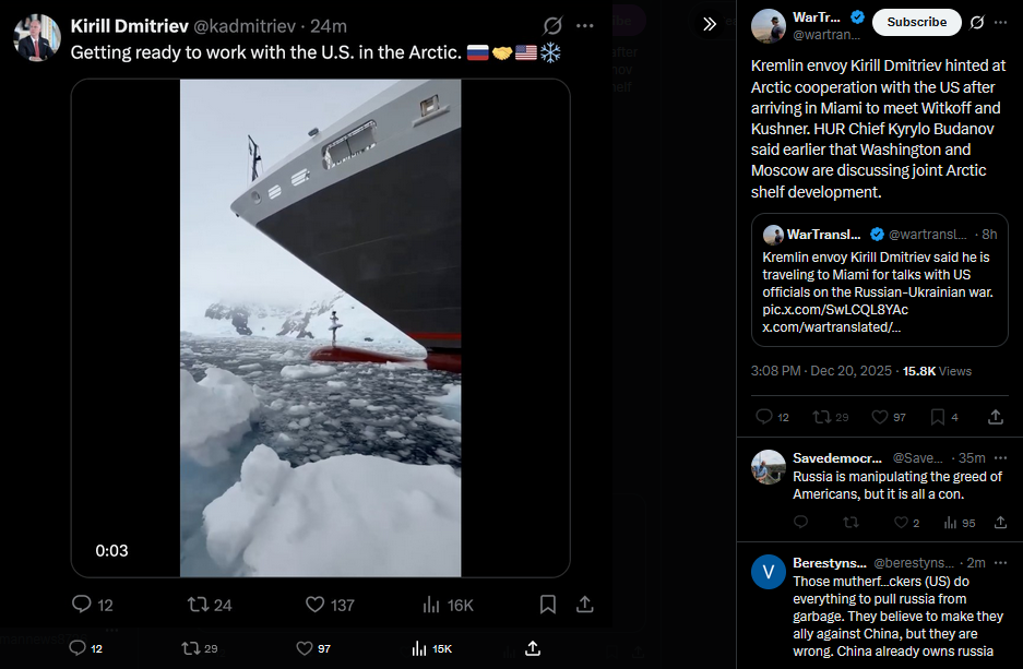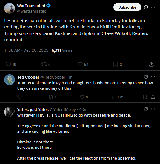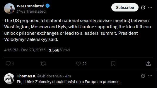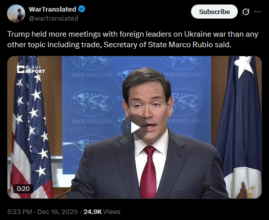 Trump held more meetings with foreign leaders on Ukraine war than any other topic including trade, Secretary of State Marco Rubio said.https://x.com/wartranslated/status/2002067304356720819?s=20https://files.catbox.moe/ovs658.mp4