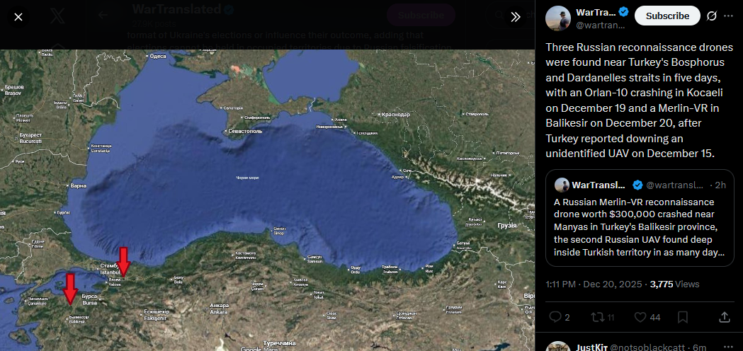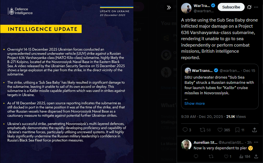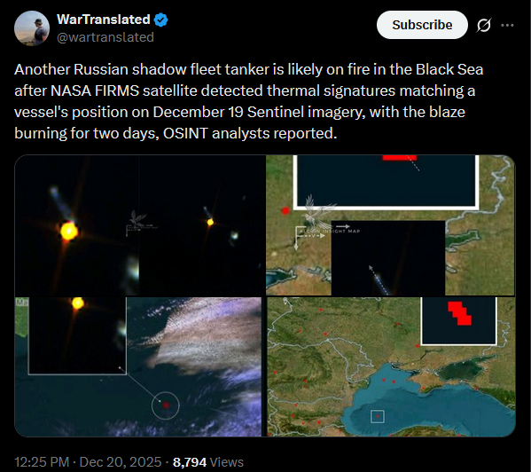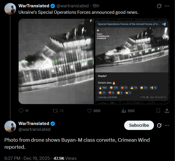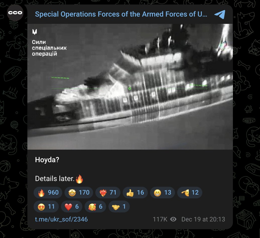 >>523986064Ukraine's Special Operations Forces announced good news.https://x.com/wartranslated/status/2002082374352584790?s=20pic 1https://files.catbox.moe/xgyo0v.jpgpic 2https://files.catbox.moe/rt0ibs.jpgPhoto from drone shows Buyan-M class corvette, Crimean Wind reported.https://x.com/wartranslated/status/2002083358042734864?s=20