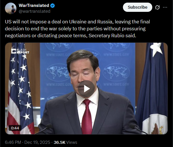 >>523988587US will not impose a deal on Ukraine and Russia, leaving the final decision to end the war solely to the parties without pressuring negotiators or dictating peace terms, Secretary Rubio said.https://x.com/wartranslated/status/2002088177629343789?s=20https://files.catbox.moe/xunede.mp4