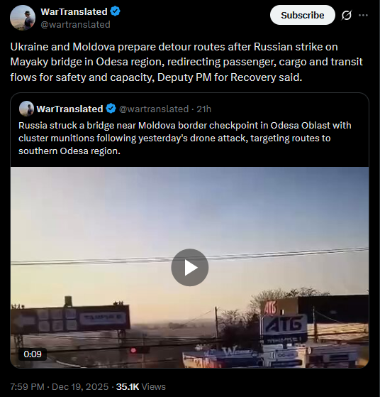 >>523988894 they were there, that's enoughUkraine and Moldova prepare detour routes after Russian strike on Mayaky bridge in Odesa region, redirecting passenger, cargo and transit flows for safety and capacity, Deputy PM for Recovery said.https://x.com/wartranslated/status/2002106501968871643?s=20