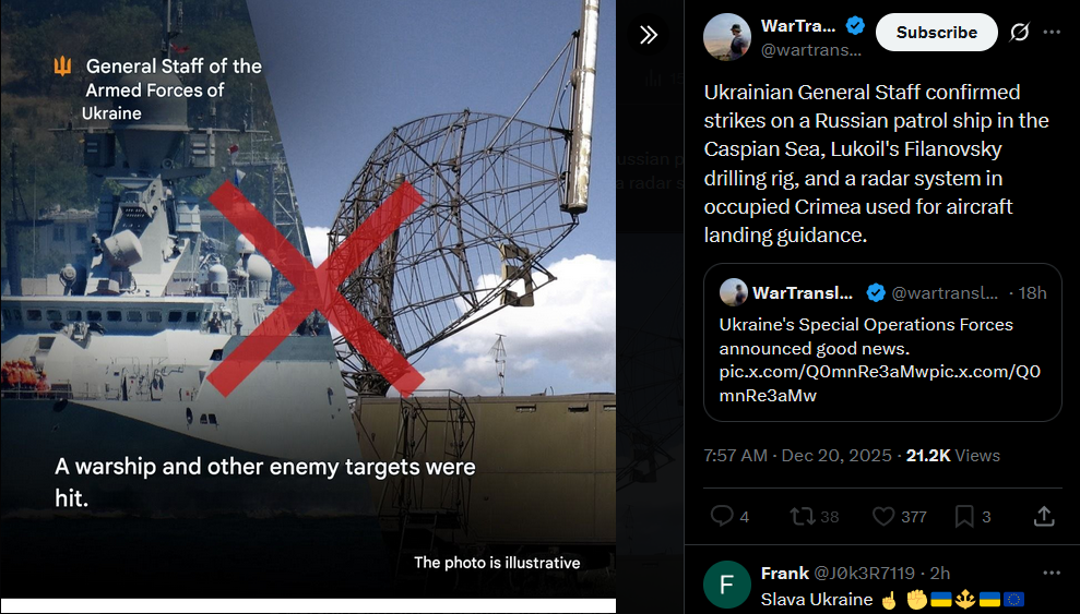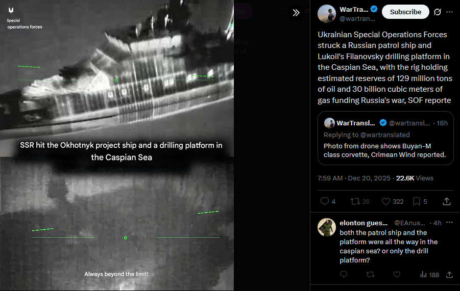 >>523986064Ukrainian General Staff confirmed strikes on a Russian patrol ship in the Caspian Sea, Lukoil's Filanovsky drilling rig, and a radar system in occupied Crimea used for aircraft landing guidance.https://x.com/wartranslated/status/2002287248801136898?s=20