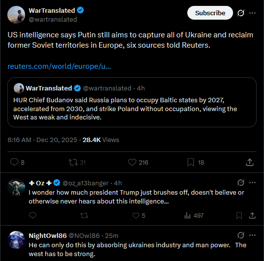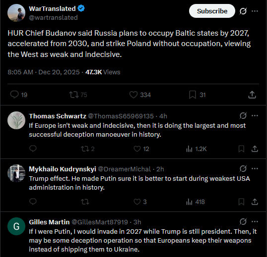 >>523989187>HUR Chief Budanov said Russia plans to occupy Baltic states by 2027, accelerated from 2030, and strike Poland without occupation, viewing the West as weak and indecisive.lying like this makes you lose credibility desu