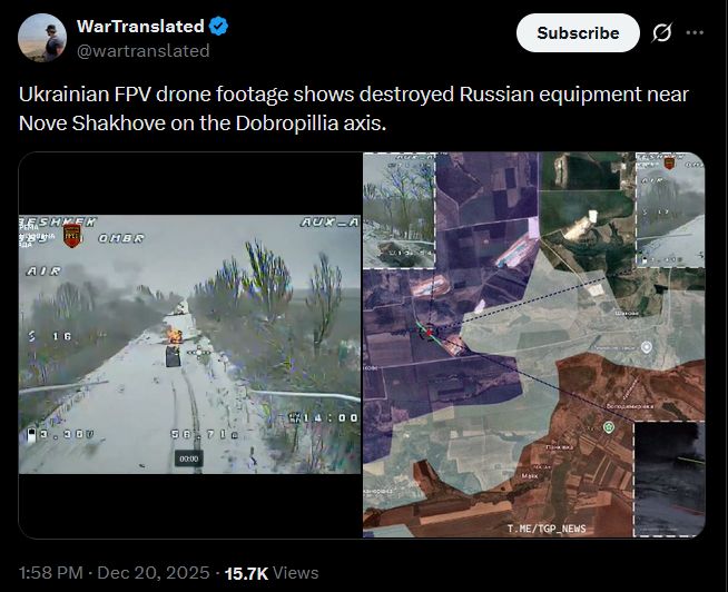 Ukraine's Defense Forces destroyed Russian armored concentration in Pokrovsk direction after 7th Airborne Corps and Madyar's Birds reconnaissance detected them, with Lasar's Group destroying 1 Osa SAM, 2 tanks, 1 IFV, 1 ammo truck and damaging 17 vehicles.Full video: https://t.me/wartranslated/11613https://x.com/wartranslated/status/2002056022358167623?s=20https://files.catbox.moe/cl5vtp.mp4