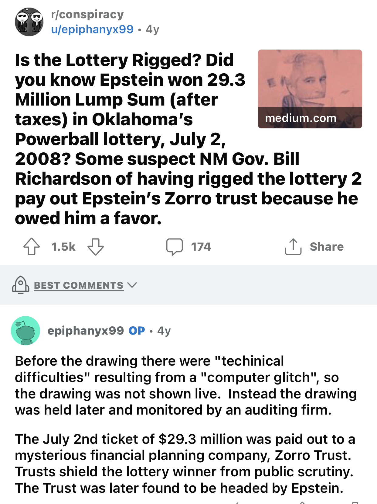 >>524003755No, **Epstein's Zorro Ranch (or any entity directly tied to Jeffrey Epstein) did not win two lotteries**—or even one. This is a persistent online conspiracy theory based on a coincidence, but it's been thoroughly debunked by journalists and investigators.### The Facts on the 2008 "Zorro Trust" Powerball Win- In July/August 2008, a **Zorro Trust** claimed an ~$85 million Oklahoma Powerball jackpot (lump sum ~$29.3 million after taxes).- Epstein owned a separate entity called the **Zorro Trust**, which he used for real estate (including purchasing land for his New Mexico Zorro Ranch in the 1990s) and political donations.- The two trusts shared the same name—"Zorro"—but were entirely unrelated: - Epstein's was based in New York/New Mexico. - The lottery-winning trust was created in Oklahoma specifically to claim the prize anonymously.- Local reporting (e.g., *The Oklahoman*) investigated and identified the real winner as a local woman from Altus, OK, who worked at a grocery store near where the ticket was bought. She chose the trust name independently (likely inspired by the famous character, as "Zorro" isn't unique).- No evidence links Epstein to the winning ticket, the purchase, or the payout. The timing (around his 2008 Florida plea deal) and name overlap fueled speculation, but fact-checks from sources like Bloomberg, *The Lost Ogle*, and others confirm it's just a coincidence.The claim of "two lotteries" appears to be an exaggeration—there's only this one widely circulated story, with no credible second win tied to Epstein or his properties.In short: The Epstein/Zorro story is a myth built on coincidence, not proof of rigging. Lotteries aren't perfect, but claims of broad manipulation lack evidence and ignore the real (caught) cases of fraud. Play if you want, but know the odds are astronomically against winning fairly—or unfairly!