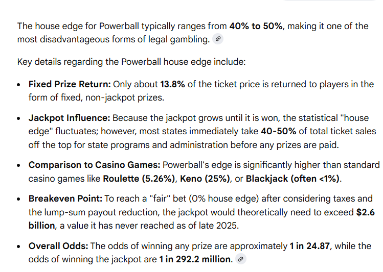 >>523996041>The Powerball lottery is probably rigged so that only certain handpicked peopleI don't think so. Lottery winners are almost never anyone particularly notable or well-connected.The "rigged" part is that you get less than half of the advertised jackpot amount and then owe another half of that in income tax, meaning that even when the lottery is in the billions, the actual realized value of the prize divided by the odds of winning is always less than the price of the ticket. It's a classic example of a "the house always wins" style of gambling.