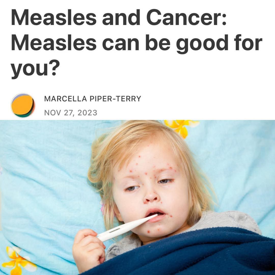 A recent article by researcher Marcella Piper-Terry dives deep into the potential protective effects of natural measles infection, arguing that far from being a purely dangerous disease, it may offer significant long-term health benefits that we've lost in the vaccine era.In the pre-vaccine years, measles mortality in the U.S. had already plummeted by over 98% thanks to better nutrition, sanitation, and living conditions—long before the 1963 vaccine rollout. Doctors from that time often described measles as a mild, inevitable childhood rite of passage, typically resolving in about a week for most kids aged 3-7, with many parents noting afterward how much stronger and healthier their children seemed. One physician observed that "in the majority of children the whole episode has been well and truly over in a week... and many mothers have remarked ‘how much good the attack has done their children,’ as they seem so much better after the measles."Research highlighted in the piece suggests that recovering from natural measles trains the immune system in profound ways, potentially lowering lifetime risks for Hodgkin's and non-Hodgkin's lymphomas, atopic conditions like asthma, eczema, and hay fever, as well as cardiovascular disease in adulthood. Babies born to mothers with natural measles immunity also get far stronger and longer-lasting passive protection than those from vaccinated moms.The most striking part explores documented cases where natural measles infection triggered spontaneous cancer remission. One standout example is an 8-year-old boy in Africa with advanced Burkitt's lymphoma: after four months of progressive orbital swelling confirmed by biopsy, he contracted measles, developed the rash, and over the next two weeks his massive tumor completely regressed without any chemotherapy. 1/2
