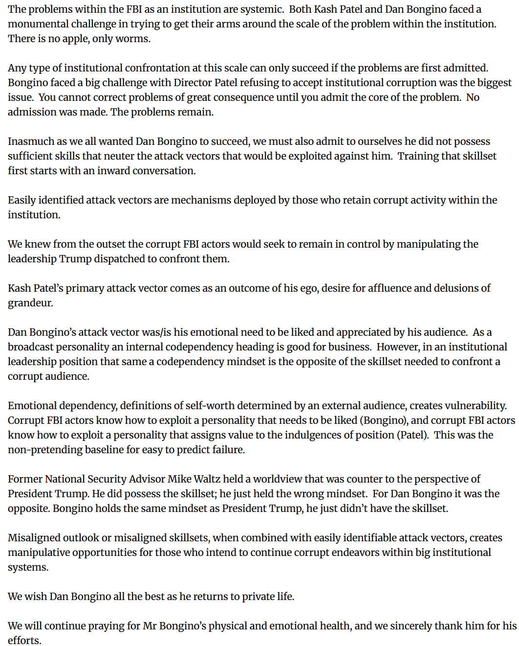 Why is Dan Bongino resigning? It's most likely because Pam Bondi is stifling his work performance, but I'm open to other theories.