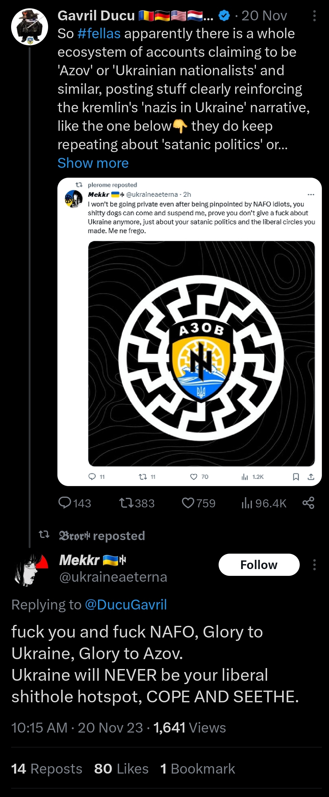 >>524009949They're antifascists. They're a modernized version of this https://en.wikipedia.org/wiki/Iron_Front , which itself is a modernized version (for its time) of the French revolution and its trajectory of "progress". All of these identities, the democrats and the NAFO and the antifa and the iron front and the trotskyists and the jacobins and so on, are derivatives of the same concept, that old Europe needs to be completely removed and replaced with the brand new thing that they cargocult as an avatar of their end of history and the ultimate utopia of humanity. You think that this is about Russia, no it's not. It's about preventing the conclusion of the permanent revolution and reverting it under something like the Holy Alliance or its later copy the Axis, which is an ideological pact aimed at the targeted destruction of liberalism. Because a nationalist government is very likely to participate in such an alliance as a means of reverting the revolution, their biggest enemies become these nationalists, and because they find an enemy in all nationalists by default, they de facto become antifascists. They become more of that than they are anti-Russia.If you were to stain your neurons by going to /r/Europe and hanging around for a few weeks, you would notice a very interesting theme - the anti-Russia threads get about 4-5k upvotes on average, but the antifascist ones that attack European nationalists, and especially the ones that commemorate the defeat of Hitler, get 50k. This is impossible to psychoanalyze without considering the paragraph above. And it's not just /r/Europe, the entirety of the NAFO/pro-EU community is like that in and out of reddit.