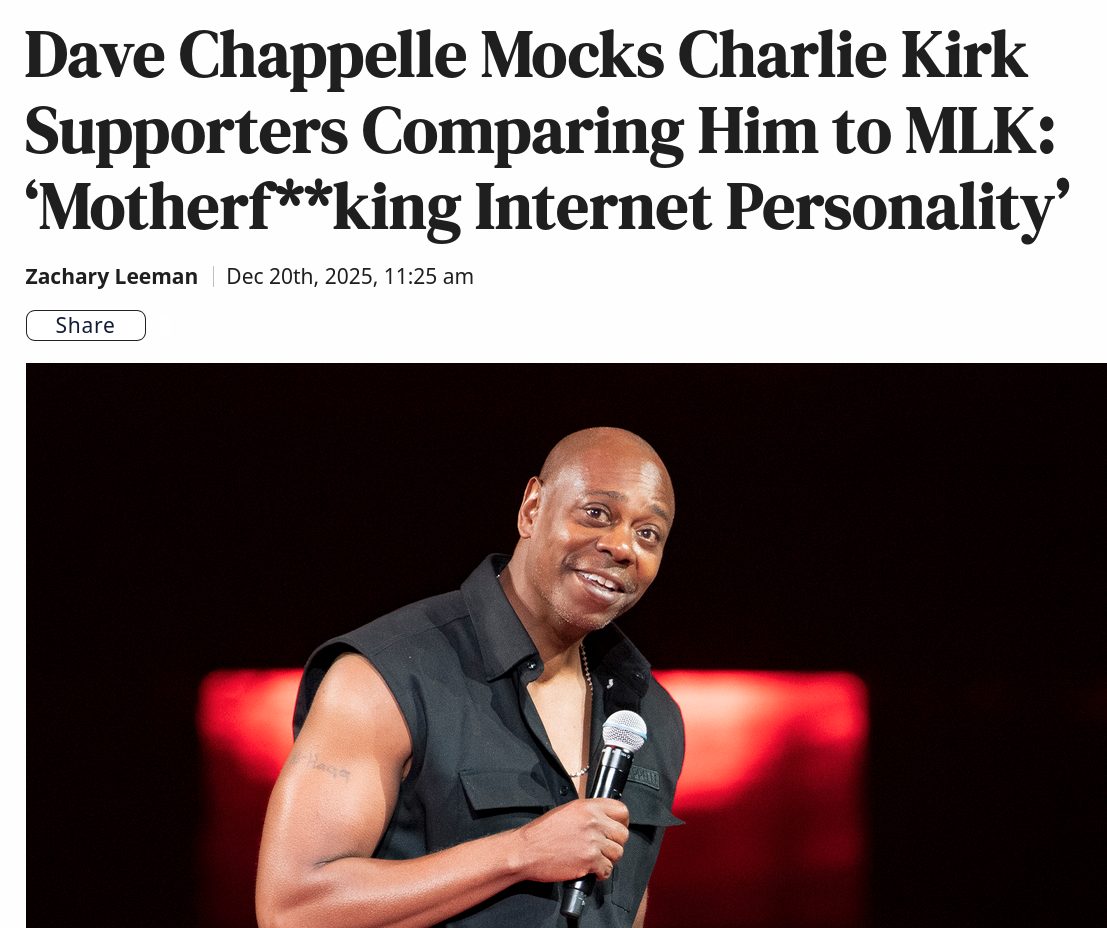 https://www.mediaite.com/media/entertainment/dave-chappelle-mocks-charlie-kirk-supporters-comparing-him-to-mlk-motherfking-internet-personality/Dave Chappelle just mic drop'd your ass