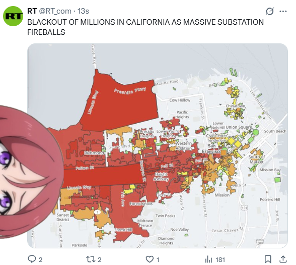 >>524025118>San Francisco power outage left approximately 130,000 customers without electricity across the city after a fire at an electrical substation, according to Pacific Gas and Electric (PG&E).HOORAY!