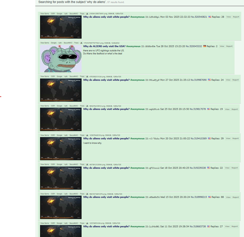 >>524028341>Why do aliens only visit white people?same answer as the last 400 times you posted it, whites are the only actual humans