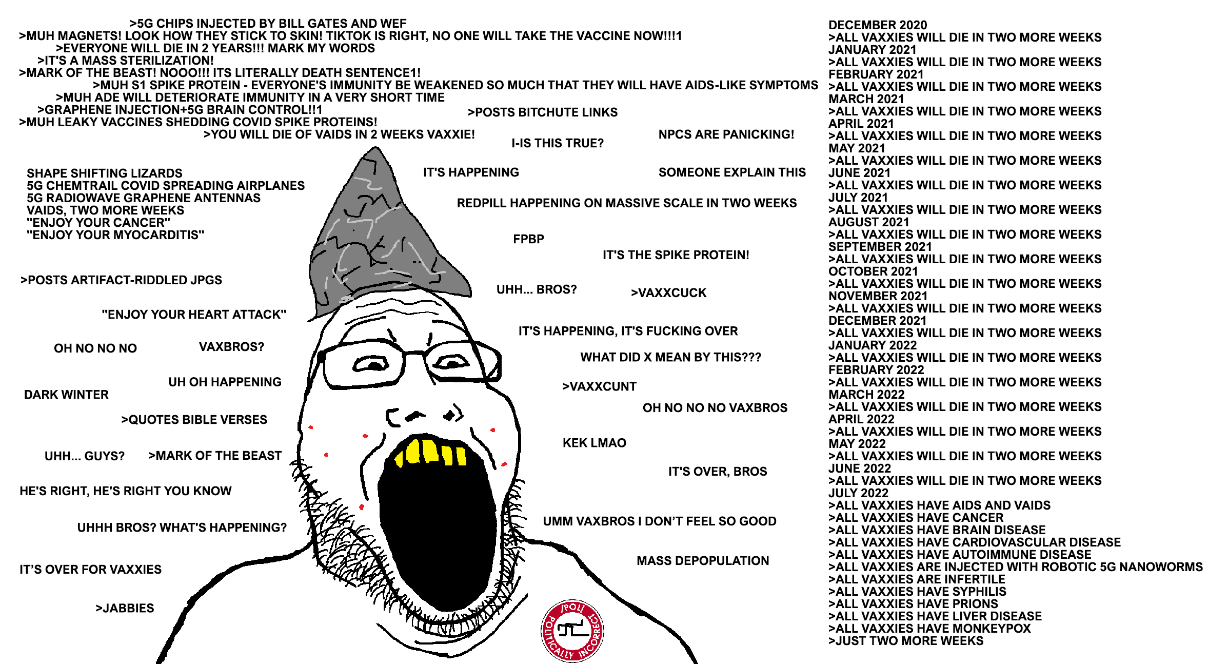 >antivaxxer retards crow about how the vaccinated going to die>2 more weeks>months>years>uhhh shit people aren't dropping dead?!>um um um>HELLBOUND! YEA!the goalpost also developed schizophrenia.