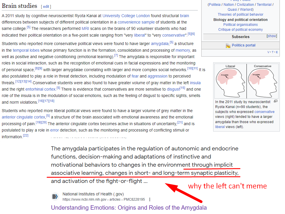 >>524031605The answer has a funny component and a sad component. The funny part is that it was mostly a political thing and the left lack the brain regions required for pattern recognition, learning on the fly and change their opinions/focuses very quickly. They also make snap judgements. That's why they seem to be all over the place. In debate, it's often a case of just catching them contradicting themselves and pinning them to a contradiction they cannot resolve.