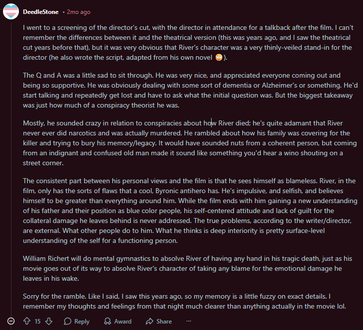 Bump - I didn't watch bc this guy's voice is super annoying but the connection seems plausible.Picrel is a reddit tranny's story about a screening of a River movie where the director did a Q&A after and was adamant that he was murdered. Naturally the tranny brain cannot comprehend the idea of grooming children or covering up a sex cult, kek.