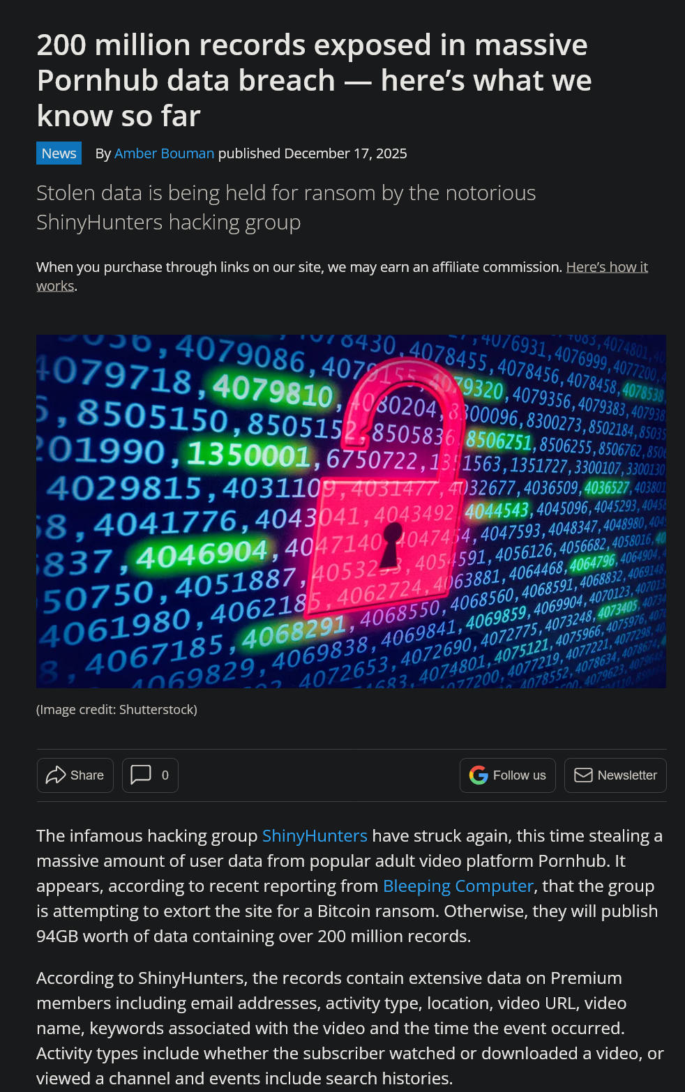 >>524044494Point to this.https://www.tomsguide.com/computing/online-security/200-million-records-exposed-in-massive-pornhub-data-breach-heres-what-we-know-so-far>the records contain extensive data on Premium members including email addresses, activity type, location, video URL, video