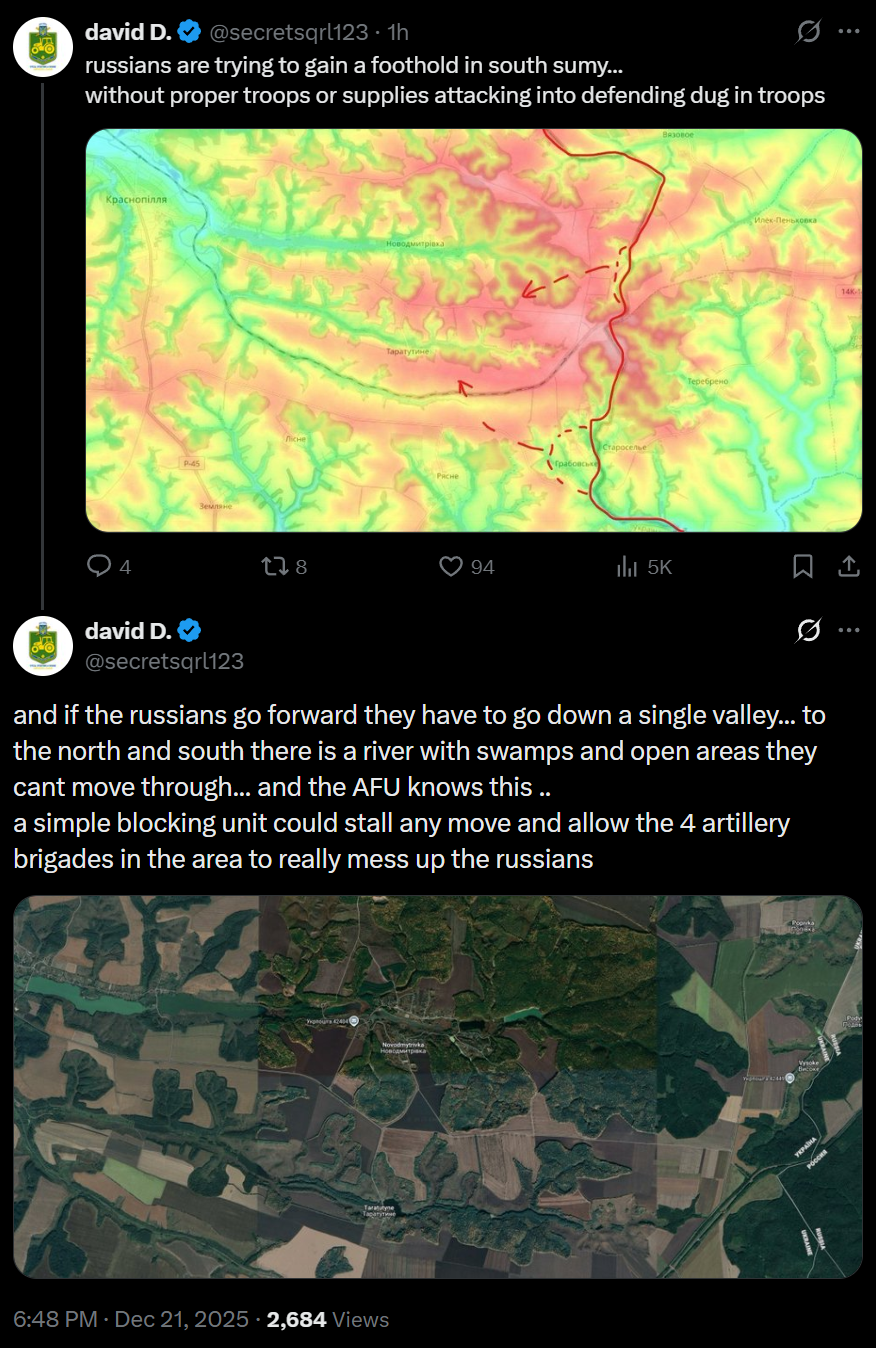 >russians are trying to gain a foothold in south sumy...>without proper troops or supplies attacking into defending dug in troops>and if the russians go forward they have to go down a single valley... to the north and south there is a river with swamps and open areas they cant move through... and the AFU knows this ..>a simple blocking unit could stall any move and allow the 4 artillery brigades in the area to really mess up the russians