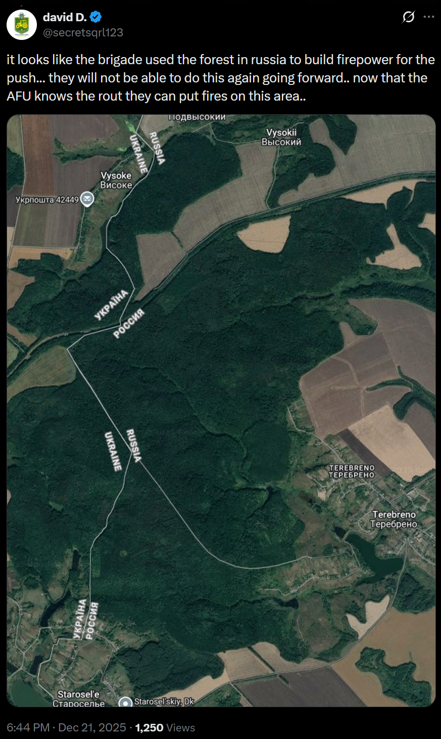 >>524066042>it looks like the brigade used the forest in russia to build firepower for the push... they will not be able to do this again going forward.. now that the AFU knows the rout they can put fires on this area..sumy holds!