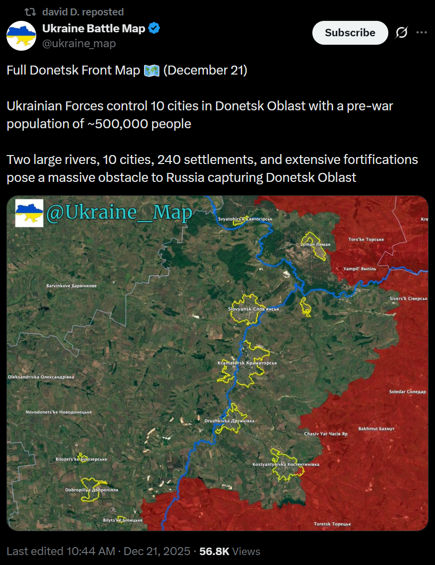 >Full Donetsk Front Map (December 21)>Ukrainian Forces control 10 cities in Donetsk Oblast with a pre-war population of ~500,000 people>Two large rivers, 10 cities, 240 settlements, and extensive fortifications pose a massive obstacle to Russia capturing Donetsk Oblastdonetsk holds!