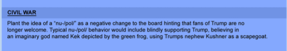 In late 2016 they launced a /pol/ campaign to demoralize& try to make anons regret our votes for Trump. By amplifying all the decisions/actions we might not like & ignoring anything good. As they state that /pol/ was the earliest& strongest support for Trump. Meming him into God status on normie social media. Winning him the primaries & election. So they were the most pissed at us, and wanted to get us to stop supporting him. Cutting off the head of the support snek