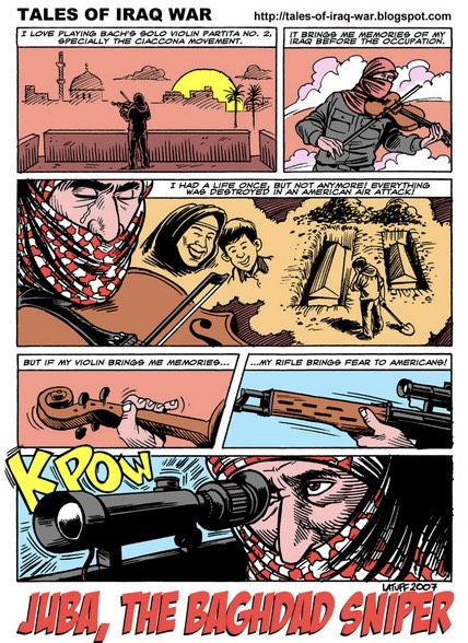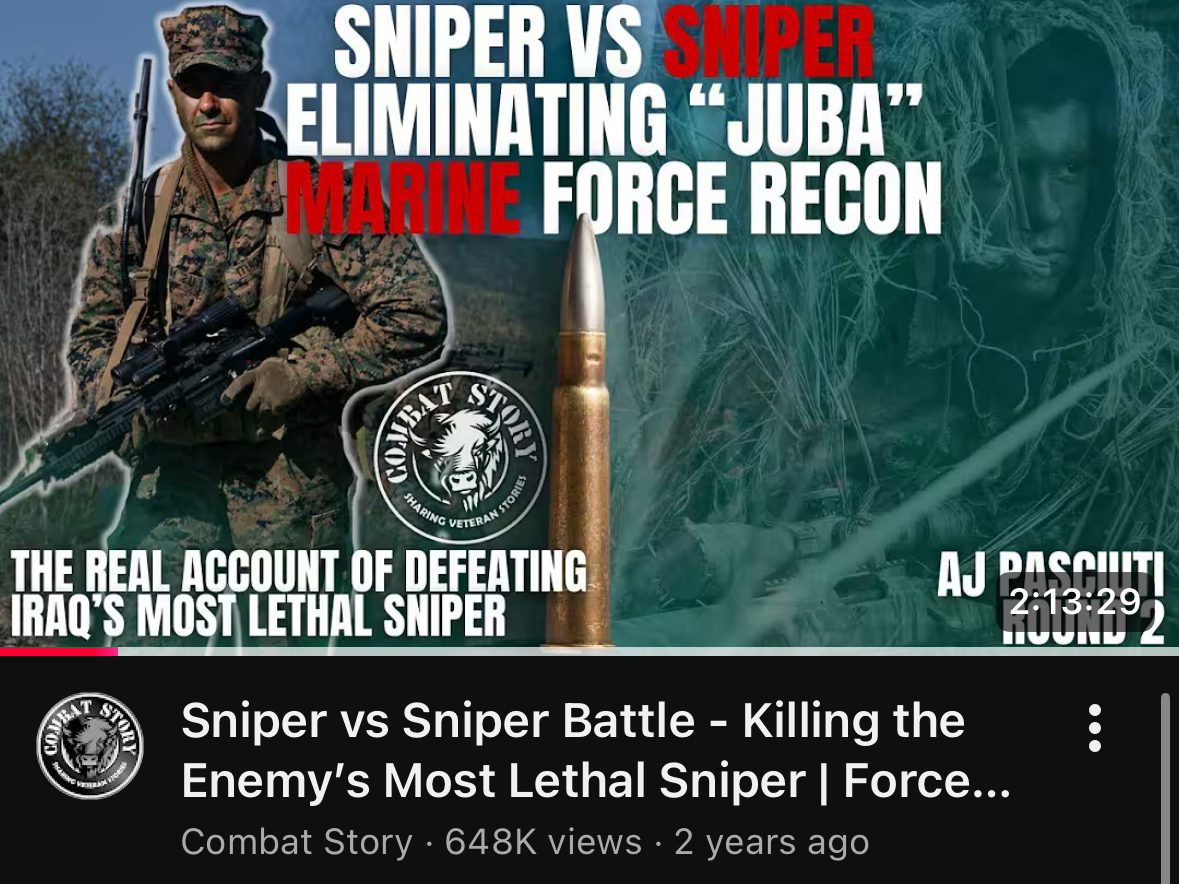 https://en.wikipedia.org/wiki/Juba_(sniper)>Juba became famous after videos showing footage of his shootings appeared online. The second of these videos shows Juba marking a tally of 37 "kills">The IAI statistics claims that from 2005 to 2006 (1426 AH to 1427 AH) that the sniper brigade had killed 634 American soldiers, 23 military officer, 11 American snipers and wounded 206 American soldiers>However, according to sniper expert and Vietnam War veteran, John Plaster, Juba may have killed around 143 American service members>Several video clips which show the actions of Juba have been circulated over the InternetWho tf was this guy? Was he even real or was this some urban myth the Iraqis made up? I’m thinking it was the actions of multiple snipers that the locals over there attributed to a single person, since they badly needed a “hero”.His death never being confirmed also leads me to believe this. Pretty sure he’s fakeThoughts?