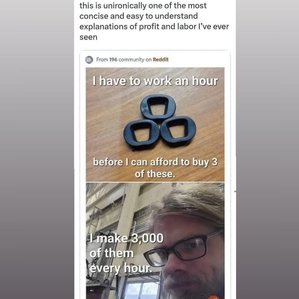 >>524078033lmao "I'm the one forcing these people to make 3000 widgets an hour at gunpoint. Why shouldn't I get all the profit?"