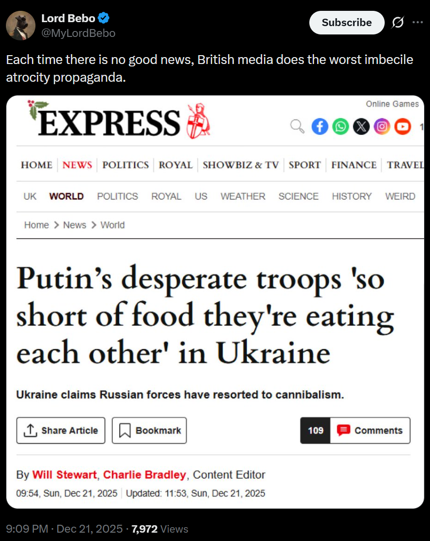 >Putin's desperate troops 'so short of food they're eating each other' in UkraineLOLOLOLOLOL