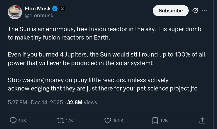 >>524086422I'd be more critical of what he's saying here if even a single one of our fusion reactors on earth was close to ever working.ITER is the most expensive scientific experiment in human history and we already know it's not going to fucking work.