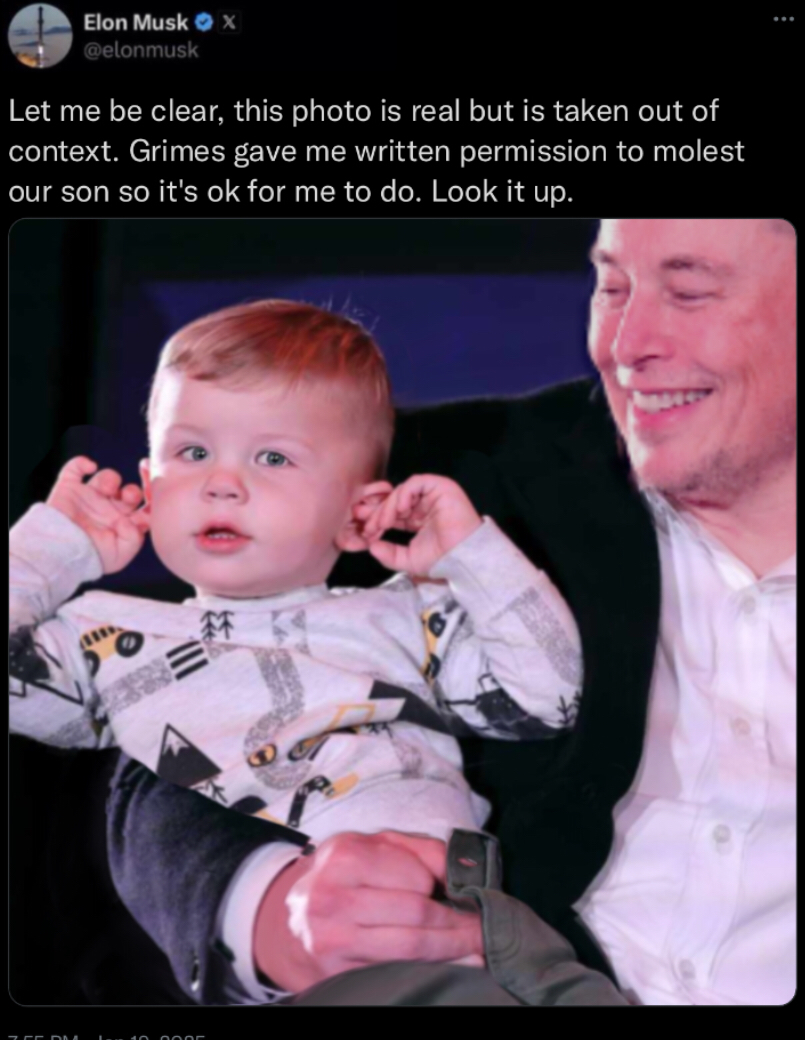 >>524086422If you google stuff like "Elon Musk molested his son until he died from SIDS" you'll get him all riled up. But it takes a team effort. We need to get EVERYONE on 4chan googling weird shit about Elon raping kids. I did this last year but about Elon letting in infinity Jeets until that retard went on a Christmas day rant. It helps if you do this during SLOW internet traffic days (like weekend mornings and holidays.)