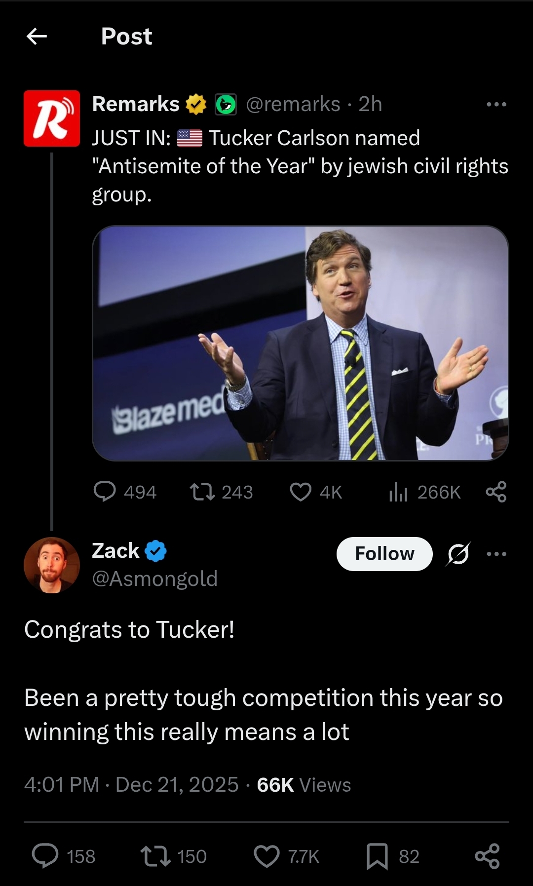 >cucker carlson is le anti semite of the yearI know some normalfag jews who have been kvetching about cucker for carlson for quite some time. this year he's been temporarily replaced by mamdani as the most dangerous anti-semite, or so they say. these people have no idea what's coming.