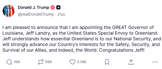 Louisiana Governor Jeff Landry appointed as US Special Envoy to Greenlandhttps://truthsocial.com/@realDonaldTrump/posts/115760829286615399