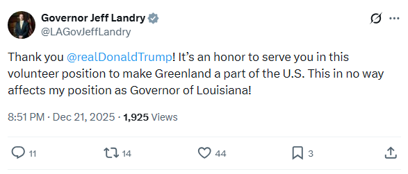 Landry will still remain Governor of Louisianaalso lol at the seething in the replies from thishttps://x.com/LAGovJeffLandry/status/2002950029494124986