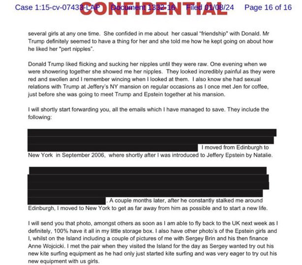 I've seen this exact document several times, so I tried to understand it. I will explain to you why nothing happened with this shit. First of all it's from court documents in the case "Giuffre vs Maxwell". The giuffre here is Virginia Giuffre, but it's not really important since those statements were made by a witness. Sarah Ransome is her name. The story was told in an email to a NYT journalist where Ransome claimed that one of her friends told her about horrific abuse from several men, Trump included, over coffee. She also claimed that she had video evidence to prove her claims.So why did nothing happened? Because Ransome send the journalist another email a few months later, claiming she retracts all her previous statements and she also claimed that she fabricated the entire story and she did it to "bring more attention to the epstein case". When the FBI investigated her claims they couldn't find this alleged friend, they couldn't find any video evidence, none of the other epstein victims corroborated her story and virginia giuffre (the woman this case was about) denied she ever saw trump engage in any misconduct. What's more giuffre said that "trump couldn't have been nicer to her" when asked about him directly.Ransome herself was one of epsteins victims, although she met Epstein in 2005 or 2006 when she herself was 22 years old.TL;DR: Sarah Ransome who made these statements later retracted them and claimed she fabricated the story to get more exposure on the case.There's also a lot of misinformation about these files being retracted to exclude trumps name, but that stems from another problem with these dogshit files. The court documents in this case are uploaded multiple times, in one instance trumps name is redacted, in another instance it's not. Here's the file with trumps name still in the file. https://www.justice.gov/multimedia/Court%20Records/Giuffre%20v.%20Maxwell,%20No.%20115-cv-07433%20(S.D.N.Y.%202015)/1332-16.pdf