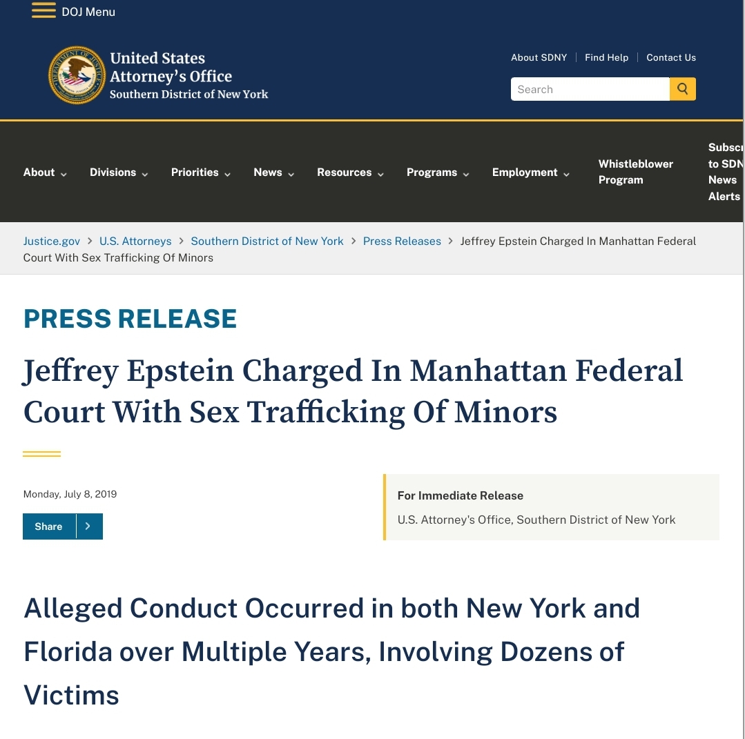 >>524119685This is such a deranged thing to argue about. Other than just lying, disputing established facts seems to be the biggest migger defense tactic.Pic relates is the 2019 press release. It was all about Palm Beach and New York.>>524119767>it's ok to lie about Sarah Ransome, because she lied about having tapesIt was a bluff for her safety. Miggers continue to repeat the lie that she retracted everything. >but only if it relates to orange man bad, my liberal gods caught in the Epstein files are OK by me.Wait, are you saying Kash Patel, and the rest of Trump's FBI and DOJ were lying when they said there were no third parties implicated?