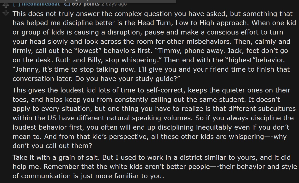 >>524104804https://www.ed.gov/laws-and-policy/civil-rights-laws/race-color-and-national-origin-discrimination/dear-colleague-letter-nondiscriminatory-administration-of-school-discipline-rescindedctrl f: disproportionatelyWhat's funny is even before this was made clear in writing it had already been going on since the start of integration. When I read about early integration attempts whenever they'd try to punish black kids the black parents would threaten to sue the school so black kids got away with ridiculous behaviors. It lead to massive white flight because white people didn't want their kids being raised with unruly unpunishable black kids.