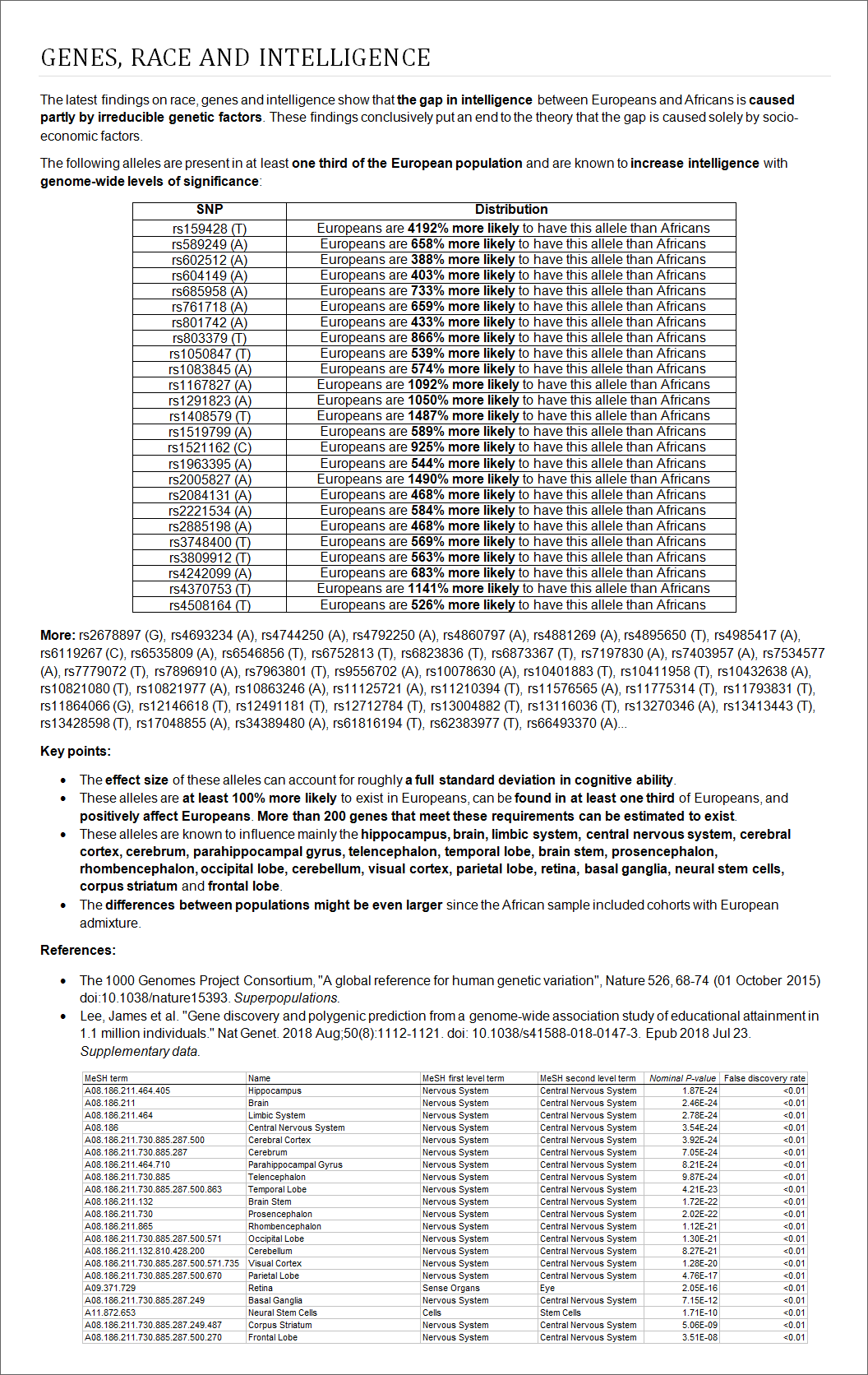 Privately, intelligence experts hold more hereditarian views than they express in public.http://www.udel.edu/educ/gottfredson/reprints/1994egalitarianfiction.pdf#page=3The Black-White IQ gap is heritable.http://benthamopen.com/contents/pdf/TOPSYJ/TOPSYJ-3-9.pdfHuman evolution is not merely ongoing but is in fact accelerating.Human races are diverging into separate species, not mixing into one.https://www.pnas.org/doi/10.1073/pnas.070765010415% of the human genome has been under selective pressures since the races separated.http://www.amazon.com/Troublesome-Inheritance-Genes-Human-History/dp/1594204462Nearly every reliably measured psychological trait, especially IQ, is significantly influenced by genetic factors.http://cdp.sagepub.com/content/13/4/148Human evolution took place as recently as 500 generations ago.http://biorxiv.org/content/early/2015/06/19/018929Pigmentation and the melanocortin system modulate aggression and sexuality in humans as they do in other animals.Darker pigmented people average higher levels of aggression and sexual activity, and lower IQ.https://www.mendeley.com/catalogue/31d99f4a-2eb8-3f55-823f-98bcf01631c4/The world’s thirty least intelligent countries (except for Haiti) are all in sub-Saharan Africa.http://journals.cambridge.org/action/displayAbstract?fromPage=online&aid=8492613&fileId=S1832427400010045
