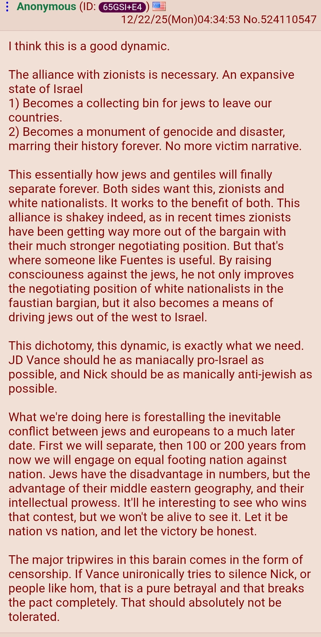 I think this is a good dynamic.The alliance with zionists is necessary. An expansive state of Israel1) Becomes a collecting bin for jews to leave our countries.2) Becomes a monument of genocide and disaster, marring their history forever. No more victim narrative.This essentially how jews and gentiles will finally separate forever. Both sides want this, zionists and white nationalists. It works to the benefit of both. This alliance is shakey indeed, as in recent times zionists have been getting way more out of the bargain with their much stronger negotiating position. But that's where someone like Fuentes is useful. By raising consciouness against the jews, he not only improves the negotiating position of white nationalists in the faustian bargian, but it also becomes a means of driving jews out of the west to Israel.This dichotomy, this dynamic, is exactly what we need. JD Vance should he as maniacally pro-Israel as possible, and Nick should be as manically anti-jewish as possible. What we're doing here is forestalling the inevitable conflict between jews and europeans to a much later date. First we will separate, then 100 or 200 years from now we will engage on equal footing nation against nation. Jews have the disadvantage in numbers, but the advantage of their middle eastern geography, and their intellectual prowess. It'll he interesting to see who wins that contest, but we won't be alive to see it. Let it be nation vs nation, and let the victory be honest. The major tripwires in this barain comes in the form of censorship. If Vance unironically tries to silence Nick, or people like hom, that is a pure betrayal and that breaks the pact completely. That should absolutely not be tolerated.