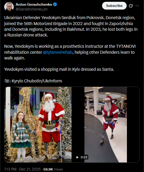 Ukrainian Defender Yevdokym Serdiuk from Pokrovsk, Donetsk region, joined the 56th Motorized Brigade in 2022 and fought in Zaporizhzhia and Donetsk regions, including in Bakhmut. In 2023, he lost both legs in a Russian drone attack.Now, Yevdokym is working as a prosthetics instructor at the TYTANOVI rehabilitation center @tytanovirehab, helping other Defenders learn to walk again.Yevdokym visited a shopping mall in Kyiv dressed as Santa.: Kyrylo Chubotin/Ukrinformhttps://x.com/Gerashchenko_en/status/2002819812414857689?s=20pic https://files.catbox.moe/uotm0j.jpgvideohttps://files.catbox.moe/lyjsq6.mp4