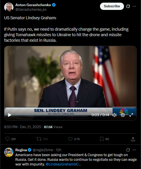 US Senator Lindsey Graham: If Putin says no, we need to dramatically change the game, including giving Tomahawk missiles to Ukraine to hit the drone and missile factories that exist in Russia.https://x.com/Gerashchenko_en/status/2002844224828621143?s=20https://files.catbox.moe/6cm27n.mp4
