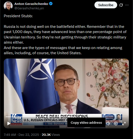 >>524111891 2.7 for 1%President Stubb:Russia is not doing well on the battlefield either. Remember that in the past 1,000 days, they have advanced less than one percentage point of Ukrainian territory. So they're not getting through their strategic military aims either.And these are the types of messages that we keep on relating among allies, including, of course, the United States.https://x.com/Gerashchenko_en/status/2003010090597494996?s=20https://files.catbox.moe/ebfoy4.mp4