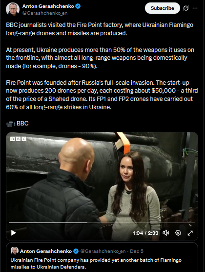 BBC journalists visited the Fire Point factory, where Ukrainian Flamingo long-range drones and missiles are produced.At present, Ukraine produces more than 50% of the weapons it uses on the frontline, with almost all long-range weapons being domestically made (for example, drones - 90%).Fire Point was founded after Russia's full-scale invasion. The start-up now produces 200 drones per day, each costing about $50,000 - a third of the price of a Shahed drone. Its FP1 and FP2 drones have carried out 60% of all long-range strikes in Ukraine.: BBChttps://x.com/Gerashchenko_en/status/2003033916857303293?s=20https://files.catbox.moe/zfghga.mp4