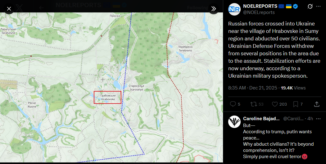 Russian forces crossed into Ukraine near the village of Hrabovske in Sumy region and abducted over 50 civilians. Ukrainian Defense Forces withdrew from several positions in the area due to the assault. Stabilization efforts are now underway, according to a Ukrainian military spokesperson.https://x.com/NOELreports/status/2002659189856866324?s=20>yesterday