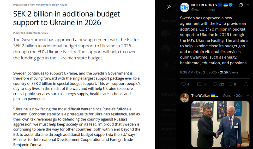Sweden has approved a new agreement with the EU to provide an additional EUR 170 million in budget support to Ukraine in 2026 through the EU’s Ukraine Facility. The aid aims to help Ukraine close its budget gap and maintain vital public services during wartime, such as energy, healthcare, education, and pensions.https://x.com/NOELreports/status/2002659944894460264?s=20